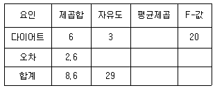 다음은 다이어트 종류에 따라 체중 감량 효과에 차이가 있는지 알아보기 위해 분산분석을 시행한 결과표이다. 이 결과에서 알 수 있는 내용으로 옳지 않은 것은? (단, Fα(k1, k2)는 분자의 자유도가 k1이고, 분모의 자유도가 k2인 F-분포의 제 ?00×(1-α) 백분위수를 나타내고, F0.05(3, 26)=2.98, F0.025(3, 26)=3.67이다)