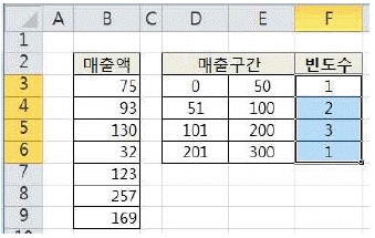 아래 워크시트에서 매출액[B3:B9]을 이용하여 매출 구간별 빈도수를 [F3:F6] 영역에 계산하고자 한다. 다음 중 이를 위한 배열수식으로 옳은 것은?