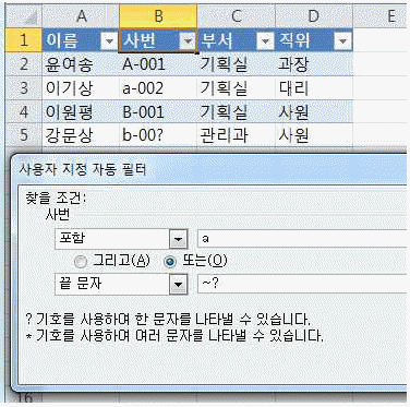 다음 중 아래 워크시트의 '사번' 필드에 그림과 같이 사용자 지정 자동 필터를 적용하는 경우 표시되는 결과 행은?