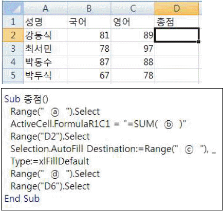 아래의 워크시트에서 [D2] 셀에 SUM 함수를 사용하여 총점을 계산한 후 채우기 핸들을 [D5] 셀까지 드래그 하여 총점을 계산하는 '총점' 매크로를 생성하였다. 다음 중 아래 '총점' 매크로의 VBA 코드 창에서 괄호() 안에 해당하는 값을 올바르게 나열한 것은?