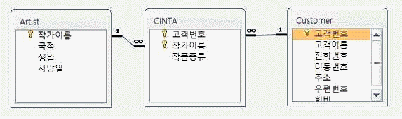 아래와 같이 관계가 설정된 데이터베이스에 [Customer] 테이블에는 고객번호가 1004인 레코드만 있고, [Artist] 테이블에는 작가이름이 CAT인 레코드만 있다. 다음 중 이 데이터베이스에서 실행 가능한 SQL 문은? (단, SQL문에 입력되는 데이터 형식은 모두 올바르다고 간주함)