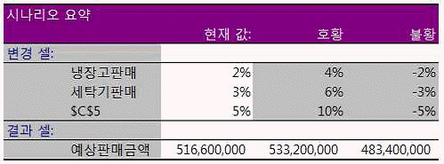 다음 중 아래 그림과 같은 시나리오 요약 보고서에 대한 설명으로 옳지 않은 것은?