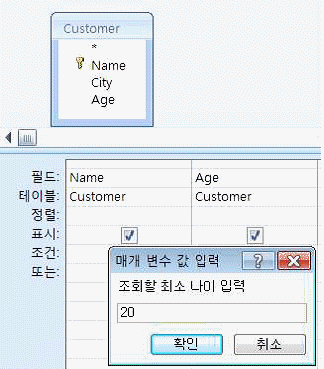 아래와 같이 조회할 고객의 최소 나이를 입력받아 검색하는 매개 변수 쿼리를 작성하려고 한다. 다음 중 'Age' 필드의 조건식으로 옳은 것은?