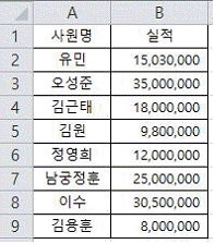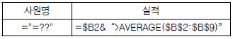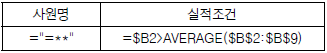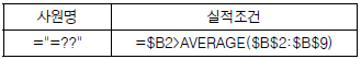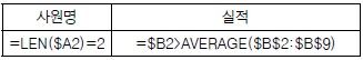 다음 중 아래 시트에서 사원명이 두 글자이면서 실적이 전체 실적의 평균을 초과하는 데이터를 검색할 때, 고급 필터의 조건으로 옳은 것은?