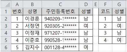 아래 시트에서 주민등록번호의 여덟 번째 문자가 '1' 또는 '3'이면 '남', '2' 또는 '4'이면 '여'로 성별 정보를 알 수 있다. 다음 중 성별을 계산하기 위한 [D2] 셀의 수식으로 옳지 않은 것은? (단, [F2:F5] 영역은 숫자 데이터임)