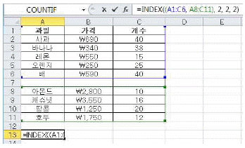 다음 중 [A13] 셀에 수식 '=INDEX((A1:C6, A8:C11), 2, 2, 2)'을 입력한 결과는?