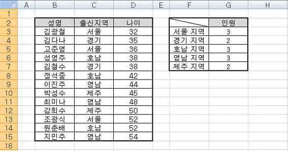 아래 워크시트의 [C3:C15] 영역을 이용하여 출신지역별로 인원수를 [G3:G7] 영역에 계산하려고 한다. 다음 중 [G3]셀에 수식을 작성한 뒤 채우기 핸들을 사용하여 [G7]셀까지 수식 복사를 할 경우 [G3]셀에 입력할 수식으로 옳은 것은?(오피스 2007 기준 문제)