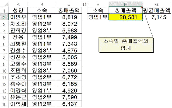 다음 중 아래의 워크시트에서 [F2] 셀에 소속이 ‘영업 1부’인 총매출액의 합계를 계산하기 위한 수식으로 옳지 않은 것은?