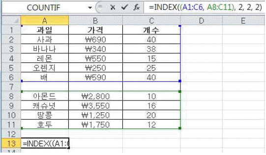 다음 중 [A13] 셀에 수식‘=INDEX((A1:C6, A8:C11), 2, 2, 2)’을 입력한 결과로 옳은 것은?