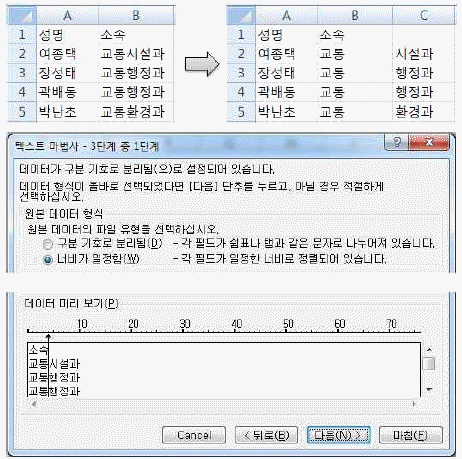 다음 중 아래와 같이 왼쪽 그림의 [B2:B5] 영역에 [텍스트 나누기]를 실행하여 오른쪽 그림과 같이 소속이 분리되도록 실행하는 과정에 대한 설명으로 옳지 않은 것은?