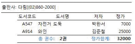 아래와 같이 보고서의 그룹 바닥글에 도서의 총 권수와 정가의 합계를 인쇄하고자 한다. 다음 중 총 권수와 정가 합계 두 컨트롤의 수식으로 옳은 것은?
