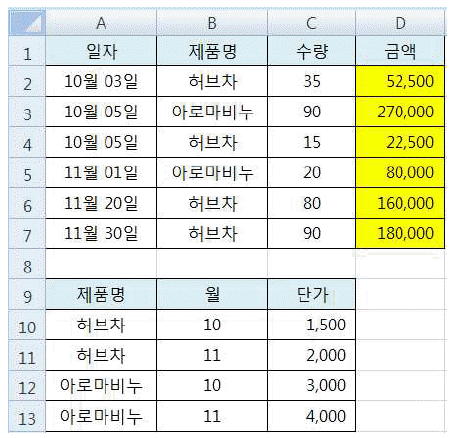 아래 워크시트에서 일자[A2:A7], 제품명[B2:B7], 수량[C2:C7], [A9:C13] 영역을 이용하여 금액[D2:D7]을 배열수식으로 계산하고자 한다. 다음 중 [D2] 셀에 입력된 수식으로 옳은 것은? (단, 금액은 단가*수량으로 계산하며, 단가는 [A9:C13] 영역을 참조하여 구함)