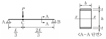 그림과 같은 단순보에서 외측의 두께 t가 내측의 두께 h보다 매우 작은 경우(t≪ h), C점에서 발생하는 평균전단응력의 표현으로 옳은 것은?