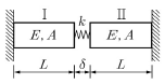 그림과 같은 구조물에서 스프링이 힘을 받지 않은 상태에서 δ는 5mm이다. 봉 Ⅰ과 봉 Ⅱ의 온도가 증가하여 δ가 3mm로 되었다면, 온도의 증가량 △T는? (단, 열팽창계수 α=10-5/℃, E=200GPa, L=1m, A=100mm2, k=2,000N/mm)