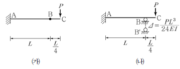 그림 ㈎에서 외부하중 P에 의하여 B점에 발생한 처짐이 이고, 그림 ㈏에서 받침 B점에 발생한 침하가 일 때, B점에 작용하는 반력(RB)의 크기는? (단, 그림㈎와 ㈏는 동일한 구조물로 B점의 경계조건만 다름)