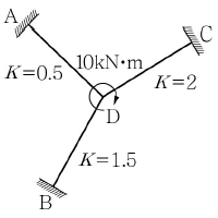 다음의 구조에서 D점에서 10kN ㆍ m의 모멘트가 작용할 때 CD의 모멘트(MCD)의 값은? (단, A, B, C는 고정단, K는 강성도를 나타냄)