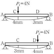 P1이 단순보의 C점에 단독으로 작용했을 때 C점, D점의 수직변위가 각각 4mm, 3mm이었고, P2가 D점에 단독으로 작용했을 때 C점, D점의 수직변위가 각각 3mm, 4mm이었다. P1이 C점에 먼저 작용하고 P2가 D점에 나중에 작용할 때 P1과 P2가 한 전체 일은? (단, P1=P2=4N 이다.)