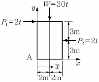 <보기>와 같이 구조물에 외력이 (P1=2t, P2=2t, W=3t) 작용하여 평형상태에 있을 때, 합력의 작용선이 x축을 지나는 점의 위치 값(m)은?