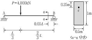 그림과 같은 직사각형 단면을 갖는 보가 집중하중을 받고 있다. 보의 길이 L이 5m일 경우 단면 a-a의 c 위치에서 발생하는 주응력(σ1, σ2)은? (단, (+) : 인장, (-) : 압축)