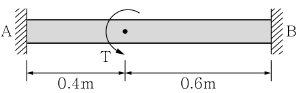 그림과 같이 양단이 고정된 원형부재에 토크(Torque) T=400N⋅m가 A단으로부터 0.4m 떨어진 위치에 작용하고 있다. 단면의 지름이 40mm일 때 토크 T가 작용하는 단면에서 발생하는 최대전단응력의 크기와 비틀림각은? (단, GJ는 비틀림 강도)