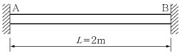 다음 그림과 같은 양단이 고정되고 속이 찬 원형단면을 가진 길이 2m 봉의 전체온도가 100℃ 상승했을 때 좌굴이 발생하였다. 이때 봉의 지름은? (단, 열팽창계수 α=10-6/℃이다.)