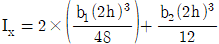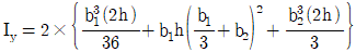 다음 그림과 같은 단면을 갖는 부재에 대하여 도심에서 가로, 세로축을 각각 x, y라고 할 때, 도심축의 단면2차모멘트 Ix, Iy및 상승모멘트 Ixy그리고 주단면2차모멘트 I1,2에 대한 식을 바르게 표기한 것은?