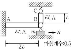 수평으로 놓인 보 AB의 끝단에 봉 BC가 힌지로 연결되어 있고, 그 아래에 질량 m인 블록이 놓여 있다. 봉 BC의 온도가 △T만큼 상승했을 때 블록을 빼내기 위한 최소 힘 H는? (단, B, C점은 온도변화 전후 움직이지 않으며, 보 AB와 봉 BC의 열팽창계수는 α, 탄성계수는 E, 단면2차모멘트는 I, 단면적은 A, 지면과 블록사이의 마찰계수는 0.5이다.)