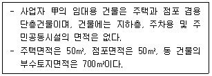 사업자 甲은 국토의 계획 및 이용에 관한 법률 제6조에 따른 도시지역 밖에 임대용 건물 1채를 보유하고 있으며 이를 乙에게 임대하고 있다. 임대부동산의 내역이 다음과 같을 때 부가가치세법상 과세되는 건물과 토지의 면적으로 옳은 것은?