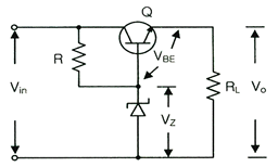 다음은 트랜지스터 직렬전압안정회로를 나타내었다. 부하전압을 5[V]로 유지하기 위한 제너다이오드의 항복전압은 얼마인가? (단, 트랜지스터의 베이스-이미터 전압 VBE = 0.7[V]이고, 입력전압 Vin = 10[V]~20[V]까지 변한다고 가정한다.)
