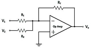 다음 연산증폭기에서 R1=R2=100[kΩ]이고, Rf=25[kΩ], V1=2[V], V2=4[V] 일 때 출력전압 Vo는?