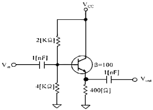 다음과 같은 증폭기의 교류 입력전압의 크기가 20[mV]일 때, 교류출력전압의 크기는 얼마인가?