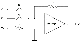 다음 연산증폭기 회로에서 R1=50[kΩ], R2=100[KΩ], R3=10[kΩ], Rf=10[kΩ]이고, V1=3[V], V2=2[V], V3=8[V]일 때, 출력전압 Vo는?