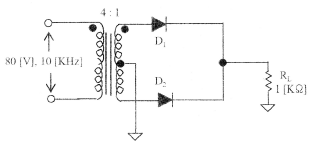 그림은 중간탭 전파정류회로이다. 80[V], 10[kHz]의 피크 정현파가 1차 권선에 인가될 때 2차측 각 다이오등 인가되는 피크전압은? (단, 다이오드 D1과 D2의 장벽전압은 0.7[V]이다.)