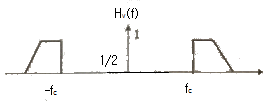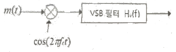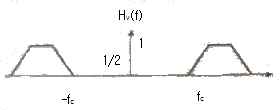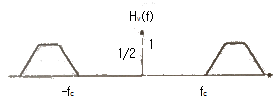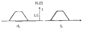 다음 그림에 나타난 VSB의 변조과정을 보면 정보신호 m(t)에 주파수가 fc인 반송파를 곱하여 DSB 신호를 만든다. 이를 VSB 필터 Hv(f)를 통과시켜서 전송신호를 만든다. 이 과정에서 사용되는 VSB 필터의 주파수응답으로 적절한 것은?