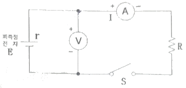 다음 회로에서 스위치 off시 전압계의 지시치를 V1=22[V], 스위치 on시 전압계의 지시치를 V2=20[V]이라 하고, R은 10[Ω]이라 할 때 전지의 내부저항은 몇 [Ω]인가? (단, 전압계의 내부저항은 아주 크고, 전류계의 내부저항은 아주 작다.)
