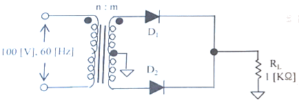 다음과 같은 정류회로에 사용된 다이오드의 최대 역전압(PIV)는 10[V]이다. 100[V], 60[Hz]의 피크 정현파가 입력될 때, 정상적인 회로 동작을 보장하기 위한 최대 권선비는? (여기서, n은 1차측 권선비이고 m은 2차측 권선비이다.)