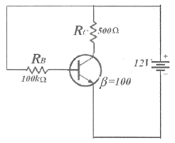 다음 그림은 베이스 바이어스 회로이다. 동작점에서 VCE전압은? (단, 베이스에미터 전압 VBE=0.7[V]이다.)