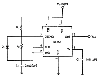 다음의 비안정 NE555회로에서 발진기의 출력(Vout) 듀티사이클 50[%] 미만으로 만들기 위한 조건으로 알맞은 것은?