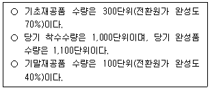 (주)한국은 가중평균법으로 종합원가계산을 적용하고 있다. 직접재료는 공정 초에 전량 투입되며, 전환원가는 공정 전반에 걸쳐 균등하게 발생한다. 생산 관련 자료는 다음과 같다.