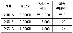 20×1년 중 발생한 결합원가가 ₩55,000일 경우, (주)한국이 제품 B에 배부할 결합원가는?