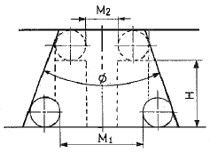 내측 테이퍼 구멍의 테이퍼 각을 지름이 일정한 한 쌍의 강구와 게이지 블록을 높이 H = 27mm로 하여 측정한 결과 M1 = 25mm, M2 = 12mm 이었다. 테이퍼 각 ø는 얼마인가? (단, 테이퍼 형상은 좌우 대칭으로 본다.)