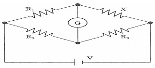다음 회로에서 미지의 저항 X의 값은 얼마인가? (단, R1=10[Ω], R2=100[Ω], R3=20[Ω], V=10[V], 검류계 G에는 전류가 흐르지 않는다.)