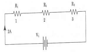 다음 회로에서 2[A]의 전류가 흐르고 저항이 각각 1[Ω], 2[Ω], 3[Ω]일 때 단자 전압 V1은 몇 [V]인가?