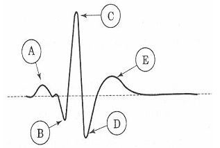 다음 그림은 심전도의 한 주기를 나타낸 것이다. 가장 큰 진폭을 보이는 ⓒ부분의 파형 이름은?