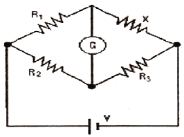 다음 회로에서 미지의 저항 X의 값은 얼마인가? (단, R1=10[Ω], R2=100[Ω], R3=20[Ω], V=10[V], 검류계 G에는 전류가 흐르지 않는다.)