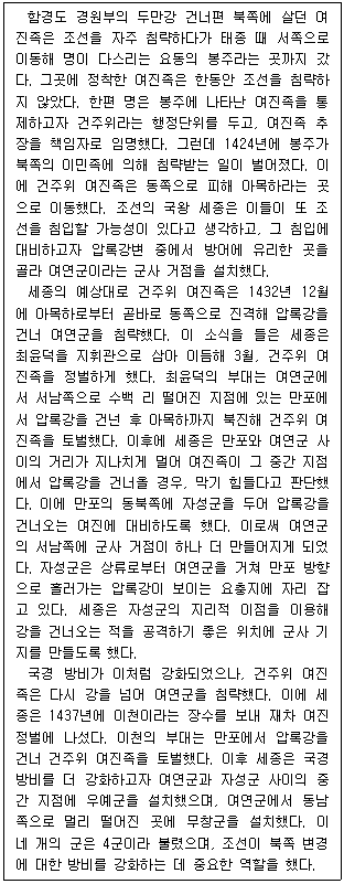 세종은 여진의 침입에 대비하기 위해 경원부를 여연군으로 바꾸고, 최윤덕을 파견해 그곳 인근에 3개 군을 더 설치하게 했다.