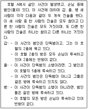 갑의 진술 중 하나만 참이라면, 이 사건의 범인은 단독범이 아니다.