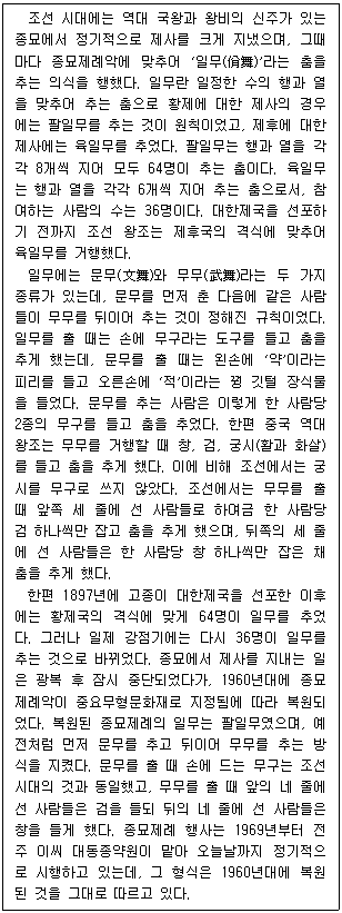 조선 시대에 종묘제례를 거행할 때에는 육일무를 추도록 하되 제후국의 격식에 맞추어 무무만 추었다.