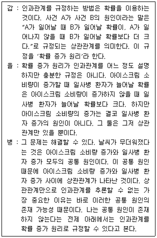 갑과 병에 따르면, 인과관계가 성립하면 상관관계가 성립한다.