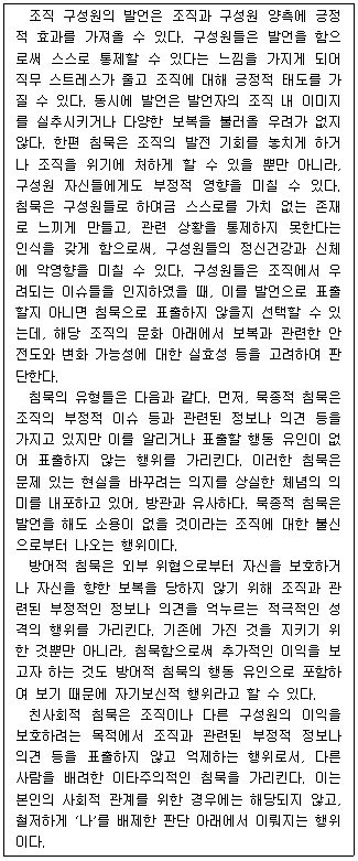 발언의 영향으로 자신의 안전이 걱정되어 침묵하는 경우는 방어적 침묵에 해당한다.